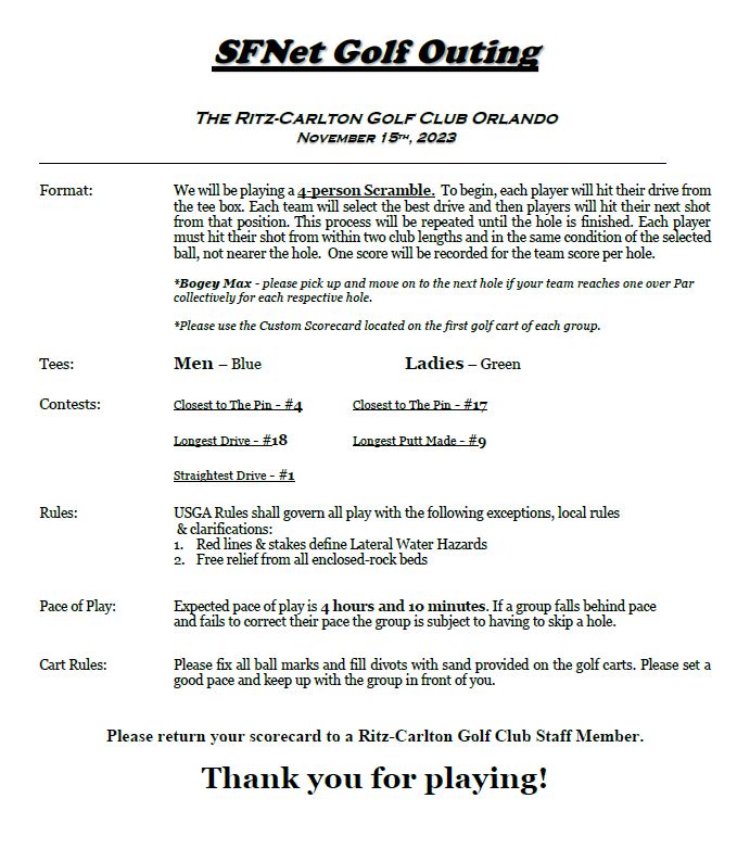 Include “Golf Outing” with your Convention registration or contact Jeff at jwalsh@sfnet.com.